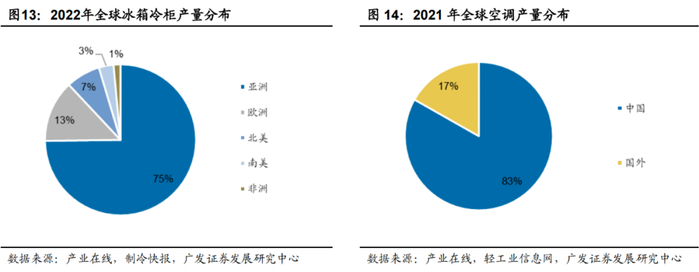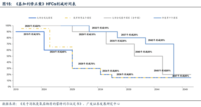 中国是全球最大的三代制冷剂生产国、消费国,《基加利修正案》规定了HFCs的使用削减时间表。根据中化蓝天集团数据,2020年我国HFCs总产能为168.3万吨,总产量为81.1万吨,出口量为17.3万吨,是全球最大的HFCs产品生产国、消费国和出口国。据产业在线数据,亚洲的冰箱和空调产量的全球占比分别达到75%和80%以上,其中中国是最主要的生产地,接受并实施该修正案意味着中国未来碳减排路径十分陡峭。根据《基加利修正案》规定HFCs削减时间表,中国应在2024年起将受控用途的HFCs生产和使用冻结在基线水平,2029年起HFCs生产和使用不超过基线的90%,2035年起不超过基线的70%,2024年起不超过基线的50%,2045年起不超过基线的20%。