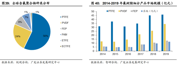 含氟聚合物需求快速增长。含氟聚合物是氟化工行业高端市场产品,具有较高的附加价值。氟聚合物制备工艺复杂,具有较高的技术壁垒,主要产品包括PTFE、PVDF、FEP、PFA等。受新能源、汽车以及通讯等领域的拉动,含氟聚合物需求快速增长。5G通讯带动PTFE新需求;锂电池新能源汽车的快速发展刺激PVDF需求,未来氢能源汽车逐步推广,全氟磺酸树脂作为氢能源电池的重要组成部分,需求有望进一步提高。