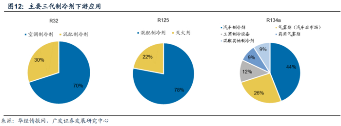 三代制冷剂主要产品包括R32、R125和R134a。R32是未来用于替代R22的主要产品,主要应用于空调制冷剂和混配制冷剂;R125主要应用于混配制冷剂和灭火器;R134a应用较为广泛,包含汽车制冷剂、气雾剂、工商制冷设备、药用气雾剂、混配其他制冷剂等。