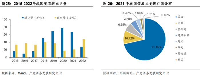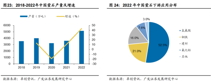 国内萤石产量逐步增加。萤石主要应用于氟化工、冶金、建材行业,根据卓创资讯数据,萤石下游52.5%用于生产氢氟酸,21%于钢铁行业,16%为建材行业。氟化工对萤石品质要求较高,一般要求CaF2含量在93%~98%,酸级萤石精粉可用于生产氢氟酸。2018-2022年萤石产量增加,2022年国内萤石产量为723.4万吨;随着国内氟化工行业的进一步发展,未来对萤石的需求会继续增加,但监管愈发严格,采矿成本不断提升,国内新增供应较难,加之随着蒙古等周边国家有价格竞争力的萤石产量不断增长,自2018年起中国成为萤石净进口国,2021年净出口约45.86万吨,主要的进口国为蒙古、南非、墨西哥。但随着2022年国内萤石产量增加,萤石进口回落,出口修复。