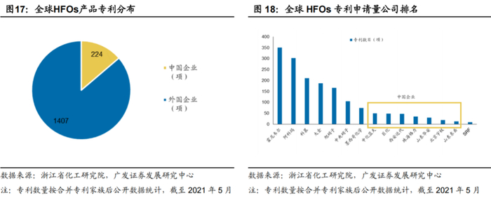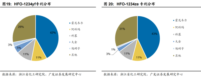 全球HFOs专利数量多,核心专利基本被外企垄断,中国占比较低。根据浙江省化工研究院数据,全球HFO专利总数超过1600项(合并同族后),平均每个产品540项专利;每项专利平均同族文本11个,共超17000个文本,最多一项专利528个同族文本。但中国企业专利数量仅占总专利数的14%,核心专利数更少,仅1.7%,大多数核心制备技术于专利掌握在外国企业手中,全球HFOs专利申请量公司前十名中仅有七家中国公司。针对主流的HFOs的制备与应用如HFO-1234yf与HFO-1234ze,杜邦(科慕)、霍尼韦尔、大金、阿科玛等跨国企业在布局全球专利,专利申请占总量的70%以上,构建了严密的专利壁垒,控制了新一代制冷剂的生产及其应用。目前国内企业在积极推进HFO-1234yf制冷剂国产化进程,但由于专利技术以及高昂价格等限制因素,主流品种受知识产权制约严重,我国HFO-1234yf制冷剂市场以及生产规模均较小。