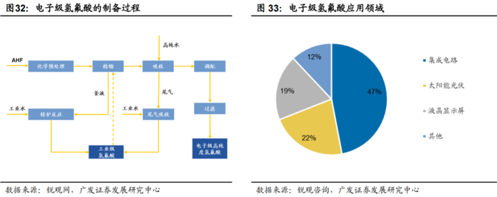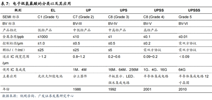 电子级氢氟酸是湿电子化学品中的一种,由约51%的高纯氟化氢和49%的高纯水组成,将无水氢氟酸进一步精馏、纯化、超滤等提纯环节可制备高端电子级氢氟酸,根据纯度不同,电子级氢氟酸可进一步细分为EL、UP、UPS、UPSS、UPSSS级氢氟酸。电子级氢氟酸主要用于去除表面氧化物,广泛应用于集成电路、光伏电池、LED显示等领域进行玻璃、芯片、硅片的清洗与刻蚀。
