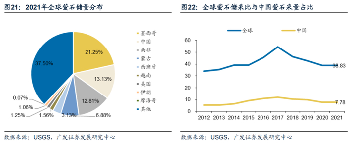 萤石在全球分布不均,根据USGS 2021年的调查数据,全球萤石储量为3.2亿吨,其中以墨西哥、中国、南非、蒙古等国家资源最为丰富,其储量约占世界总量的54%。中国萤石矿床主要分布于浙江、内蒙古、湖南、江西、福建、河南等省区。大中型萤石矿床集中于东部沿海、华中和内蒙古中东部。中国萤石矿床可分为三类:为沉积改造型、热液充填型和伴生型,其中伴生型矿床为重要矿床。