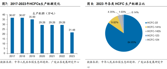 2023年国内HCFCs生产配额下降26.63%。根据2023年度含氢氯氟烃生产和使用配额核发表,2023年国内HCFCs生产配额为21.48万吨,相较2022年下降26.63%,内用生产配额12.90万吨,相较2022年下降25.78%。2023年各类HCFC生产配额中,R22是二代制冷剂占比最大的产品,2023年占全国二代制冷剂总生产配额约85%,相较于2022年提升约8pct,R22主要应用于空调制冷领域与含氟聚合物制备。2023年HCFCs使用配额为2.66万吨,相较2022年下降29.38%,其中房间空调器行业HCFCs使用配额为20265吨,占比约76%,工商制冷空调行业HCFCs使用配额为5413吨,占比约20%。