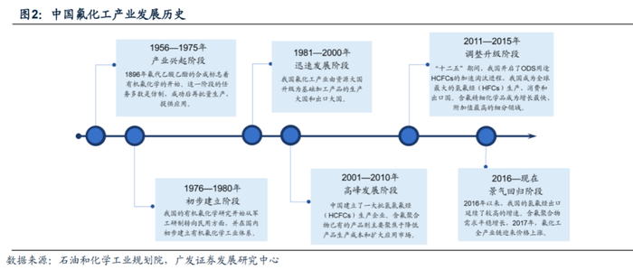 国内氟化工行业从起步至今已有70余年历史,凭借着丰富的萤石资源与下游广阔的市场,国内氟化工产业自改革开放以来迅速发展。国内氟化工行业发展历程可大致分为六个发展阶段:产业兴起阶段、初步建立阶段、迅速发展阶段、高峰发展阶段、调整升级阶段和景气回归阶段。