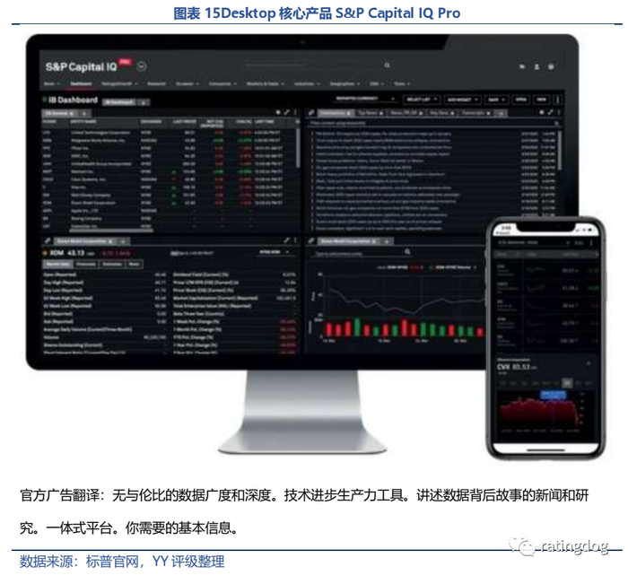 回溯标普的历史,新业务线的开辟主要来自于母公司麦格罗﹒希尔(McGraw﹒Hill)的对外并购,在整合各类数据源之后,顺势推出集成数据平台Market Intelligence(市场财智)。