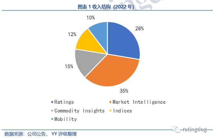 标普的业务较为纷杂,2022年2月完成对IHS Markit的收购和拆分后,现有五条业务线:1)评级服务(Ratings),即标普评级,业务模式可对标穆迪的穆迪投资者服务(MIS),是公司的基石业务之一(营收占比28%),2022年由于结构化产品发行量大幅减少,评级收入下滑26%;2)市场财智(MarketIntelligence),业务模式可对标穆迪的穆迪分析(MA),但是其整合的资源更为丰富,包含公司旗下评级、商品、指数等资源,是Bloomberg的主要竞品之一,2022年并购IHS后收入增长70%,从第二大业务(营收占比27%)变为第一大业务(35%);3)商品资讯(Commodity Insights,又称Platts),主要提供能源和商品市场的信息和基准价格,2022年并购IHS后收入增长77%,业务重要性大幅提高(营收占比15%);4)汽车产业链(Mobility),并购HIS后的新增业务,为汽车全产业链的参与者及金融、保险公司提供信息与咨询服务;5)指数(Indices),主要是道琼斯指数和标普指数,帮助投资者锚定价格,营收占比长期稳定在10%~15%。另外,2023年1月,标普将并购IHS后形成的工程业务线(Engineering Solutions)打包出售,聚焦于金融数据服务商这一核心定位。