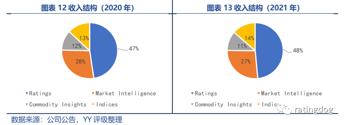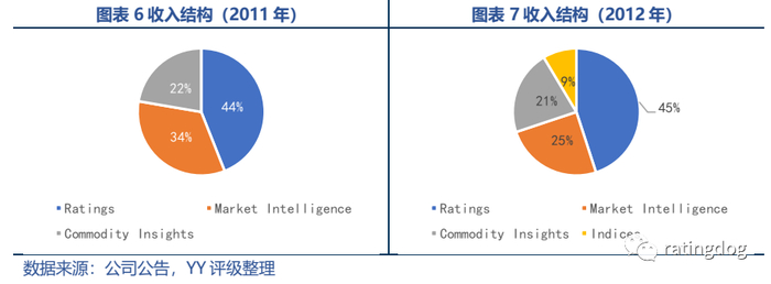 2012年标普(彼时还未更名)对于业务进行了重大调整:1)剥离教育业务,总营收同比减少29%;2)并购道琼斯指数,进而将指数业务从Capital IQ(市场财智的前身)中独立出来;3)三类固收资产(企业债券、银行贷款、基于CLO的结构化产品)发行量增加带动评级业务增长,收入占比提高1%。