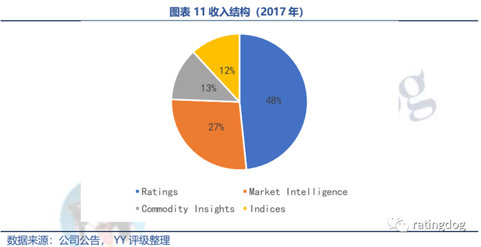 2017年固收资产发行量增长带动评级业务占比增长至48%,同时出售从事汽车市场调查及数据业务的J.D.Power导致商品资讯收入占比进一步减少至13%,22年收购IHS重新开拓汽车产业链业务。