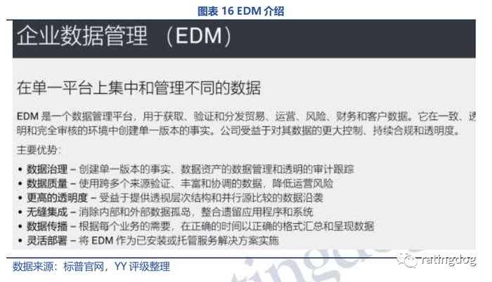 3)企业数据管理(Enterprise Solutions):业务的核心是帮助客户管理和分析数据,从而实现发现风险、管理成本、满足监管要求等三大功能。主打产品为Enterprise Data Management(EDM),面向大资管客户的企业数据管理平台,机构客户超过100家,但是产品数据可以保存在云端(SaaS平台),因此数据的安全性与企业的中立性需要得到保证。
