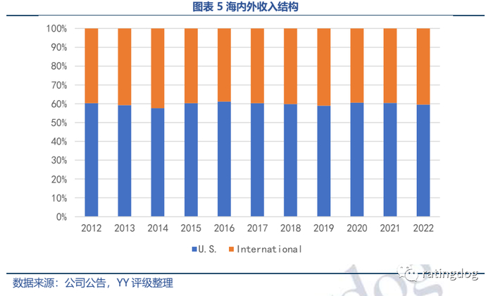 从海内外收入结构来看,美国:非美地区较为稳定,一直在6:4左右波动,公司的战略定力较强,业务区域较为稳定,部分原因在于2012年至今,国际金融市场格局在美国与非美地区之间并未发生较大变化,至于公司在12年之前(尤其是08年金融危机期间)的发展格局是否有较大变化,由于年报未披露,所以不得而知,但是从披露内容的重要性而言,12年之前未披露区域收入结构,可能是因为海外收入重要性较低,2012年收购道琼斯指数、增加全球糖及燃料市场信息、收购英国评级机构,增加了海外市场布局。