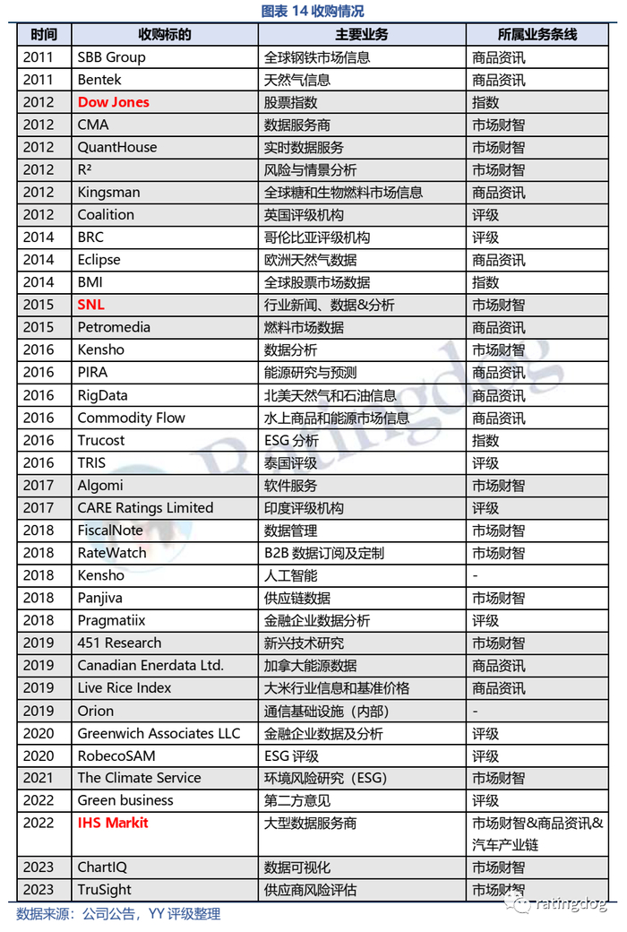 从对外并购的情况来看,评级业务的收购主要是为了获取海外市场的牌照,近年来并购更多集中于市场财智领域,不断拓展数据来源渠道和数据触达方式。