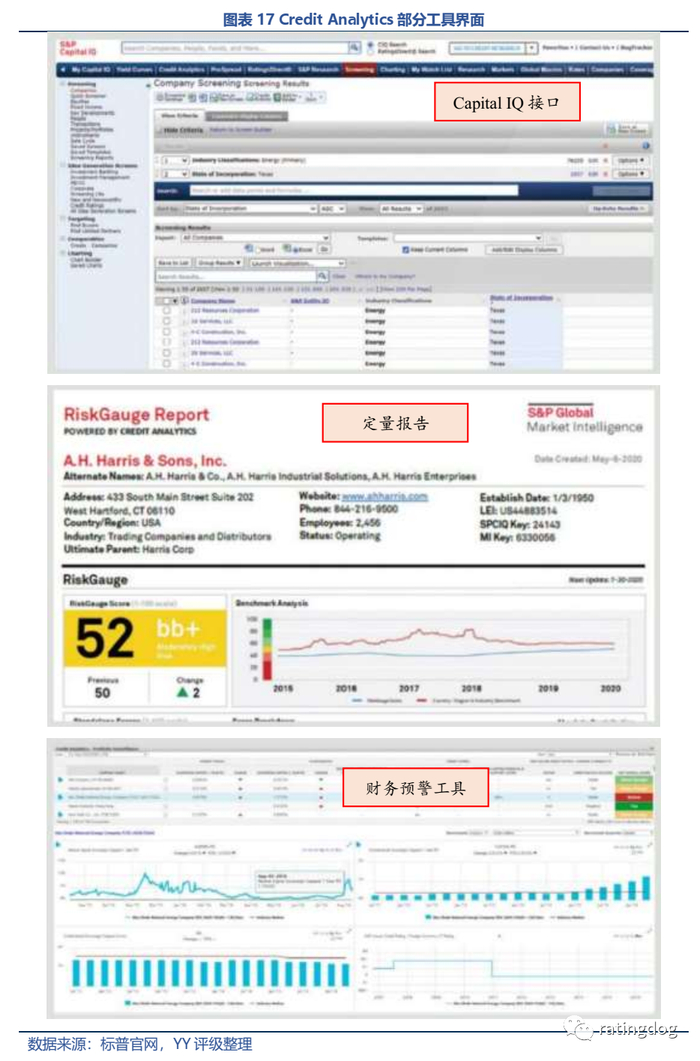 CreditAnalytics是帮助客户管理综合风险敞口的集成服务,所包含的各类辅助工具均已并入Capital IQ,属于信息终端的增值服务(需单独开通)。包括:全球企业信用风险分析(相比于偏重定性的评级报告而言,更加定量)、违约追偿模型、交易对手财务预警等一系列工具。