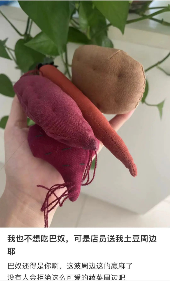 面对此前富硒土豆的舆论压力,巴奴也曾尝试过化解。有消费者在社交平台表示,在巴奴门店问工作人员“有18元5片的土豆吗?”就能拿到土豆同款周边,多位消费者都晒出了红薯、辣椒、胡萝卜等周边产品。对此,业内有观点认为,巴奴是在以“自嘲”的方式来面对舆论。