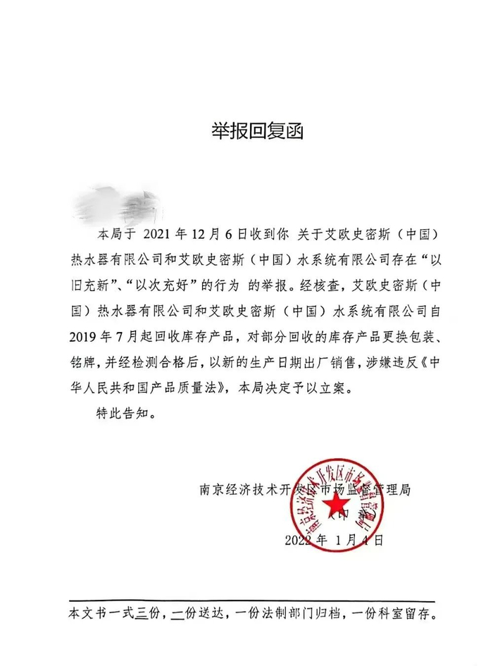 2022年1月,南京经济技术开发区市场监督管理局回复举报认为,A.O.史密斯公司行为涉嫌违反《中华人民共和国产品质量法》,决定予以立案调查。国家市场监督管理总局质量司回复蒋斌称,不能将翻新机修改新的生产日期,仍然应该使用原来的生产日期。