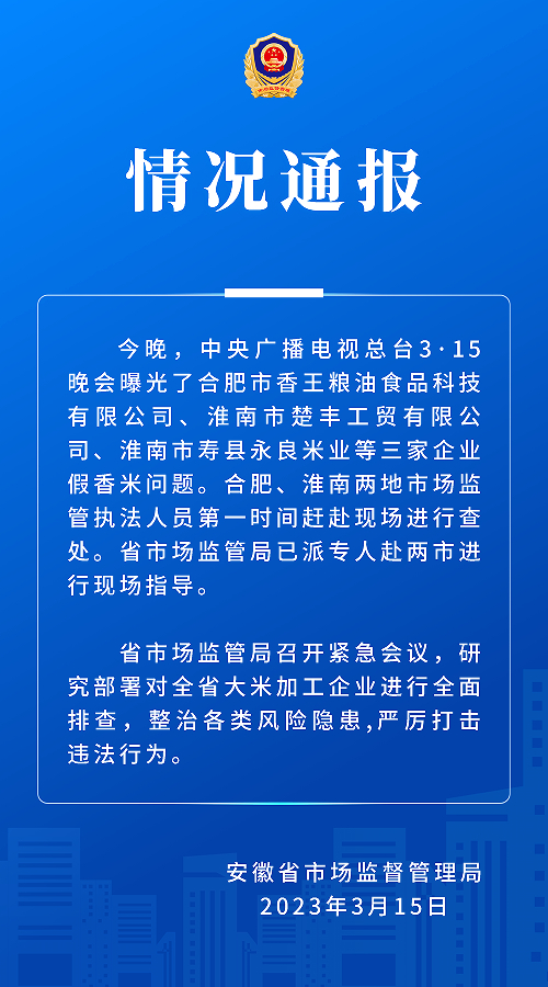 3月15日晚,安徽省市场监督管理局发布通报: