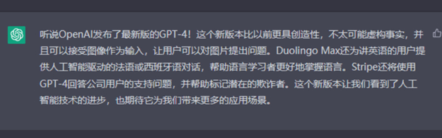 我们先将一段报道GPT-4推出的英文发给ChatGPT,要其翻译。这部分GPT-3.5和GPT-4的整体区别存在但是不明显。如GPT-4翻译为“人工智能驱动的法语或西班牙语的对话”,GPT-3.5翻译成了“法语或西班牙语的AI驱动对话”。