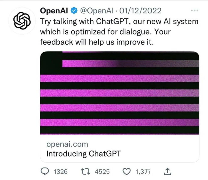 去年11月30日,ChatGPT上线得静悄悄,OpenAI的官方推特账号发布了一篇文章,宣布产品发布的好消息。
