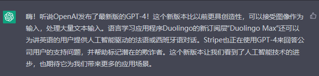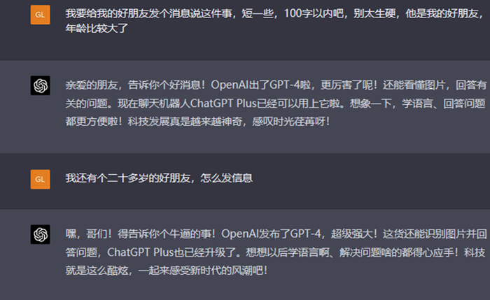 当我们进一步提出要求时,新模型的表现开始明显好于前代。比如“给年轻的朋友转述这个消息”,GPT-4的回答很本土化:“嘿,哥们”“得告诉你个牛X的事儿”“这货还能识别图片”。
