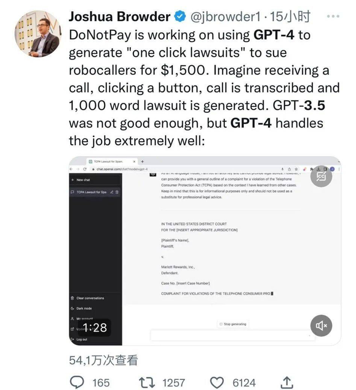 人工智能公司DoNotPay的CEO乔舒亚(Joshua Browder)在推特上表示,正在致力于用GPT-4打击骚扰电话,将其称为“一键诉讼”。针对骚扰电话和自动拨号软件起草起诉书,要求对方赔偿1500美元:“想象一下,你接了个电话,按了一个键,然后1000词的起诉书就写好了。”