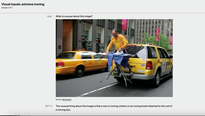 你不服气,又扔过去一张无厘头的梗图,它不但能看懂这张图里有车有人,还能告诉你之所以好笑是因为“这个男人在出租车上面熨衣服”。