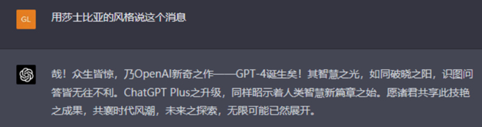 当我们让GPT-4模仿莎士比亚转达这个消息时,其回答颇为惊艳:“哉!众生皆惊,乃OpenAI新奇之作——GPT-4诞生矣!其智慧之光,如同破晓之阳,识图问答皆无往不利……”但GPT-3.5则显示发来一大段英文,当我们要求用中文时,文本不能说和莎翁有什么关系,最多是有点译制片腔调:“哦!快来听听这个消息……”