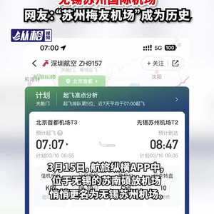3月15日,航旅纵横APP中,位于无锡的苏南硕放机场悄悄更名为无锡苏州机场。