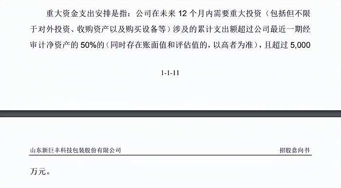 在重大资金支出安排上,新巨丰野心巨大。新巨丰在招股书中表示,未来12月内需要重大投资(包括但不限于对外投资、收购资产以及购买设备等),涉及的累计支出额超过公司最近一期经审计净资产的50%,且超过了5,000万元。