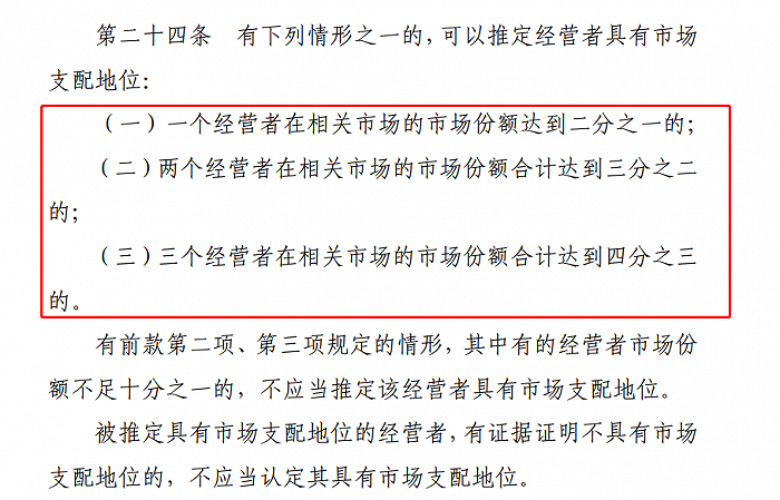 具体而言,在新《反垄断法》第二十四条中指出,两个经营者在相关市场的份额合计达到三分之二;三个经营者在相关市场的市场份额合计达四分之三的。这些都构成可以推动经营者具有市场支配地位。
