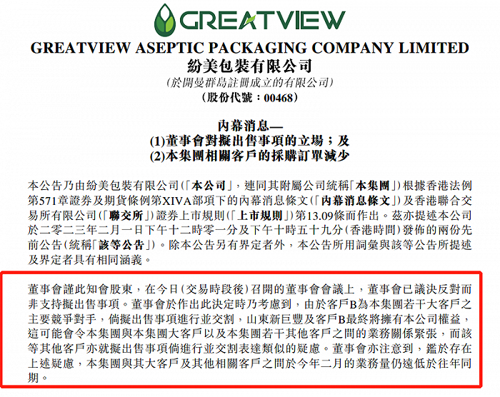 纷美包装在公告中表示,大股东出售公司股份于新巨丰,很可能会引起客户A的疑虑,例如对于本集团保护客户A机密资料的方面。另外,纷美包装还表示,其他客户向集团反映类似客户A的疑虑,并表示倘客户A与集团终止商业来往,彼等亦可能会跟随客户A的决定。这意味着,新巨丰的收购可能演变成“恶意收购”,会给纷美包装未来经营施加决定性影响。