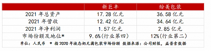 从过往业绩来看(如上图表来看),纷美包装总资产、营收及净利润分别是新巨丰的2.1倍、2.8倍及1.8倍。