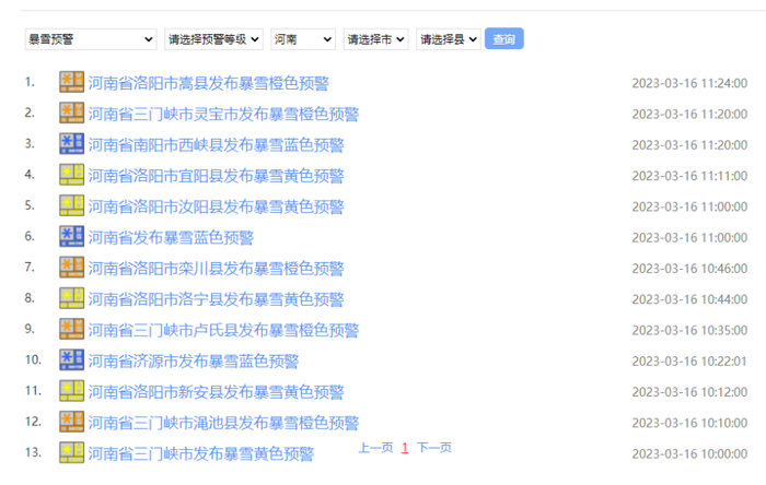 据@河南日报 消息,河南省气象台11时发布暴雪蓝色预警,今天河南多地将出现降雪,提醒大家注意防范。记者刚刚从省气象局获悉,三门峡、洛阳、济源示范区等多地发布12个暴雪预警(信号)。目前,洛阳市嵩县、栾川,三门峡市卢氏县、渑池县处于暴雪橙色预警中;洛阳市宜阳县、汝阳县、新安县、洛宁县,三门峡市灵宝市处于暴雪黄色预警中;南阳市西峡县处于暴雪蓝色预警中。
