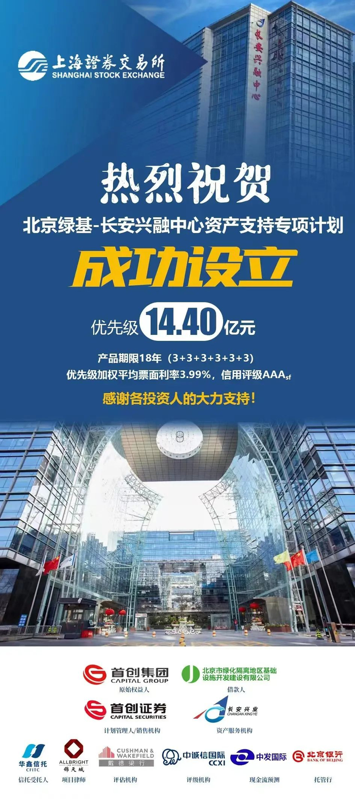 近日,由首创集团作为原始权益人,北京市绿化隔离地区基础设施开发建设有限公司作为实际借款人的“北京绿基-长安兴融中心资产支持专项计划”于上交所成功发行,优先级发行规模共14.40亿,信用评级AAAsf,加权平均票面利率3.99%,信达证券担任本项目主承销商/销售机构。