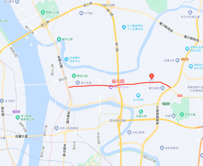福元路横向穿过长沙河东主城北部,西至芙蓉路,东与万家丽路相接;区域东部靠湖南广电,向西与长沙“陆家嘴”滨江新城隔湘江相望;南接国家级的马栏山视频文创产业园、长沙老牌金融中心芙蓉中路金融商务区;北依最近迎来高速发展的城市副中心“长沙北中心”。
