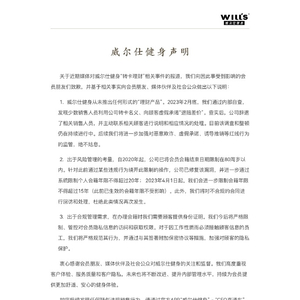 衷心感谢会员朋友、媒体伙伴及社会公众对威尔仕健身的关注和监督。我们高度重视客户体验、服务质量和客户隐私,未来也将不断改进、提升内部管理水平,持续为会员提供更加舒适、安心的健身体验。