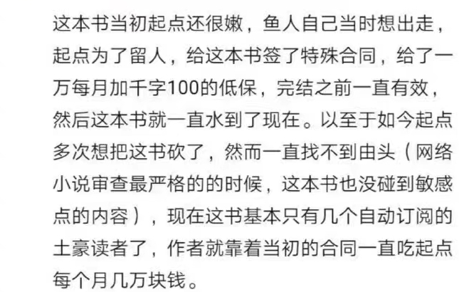 一部小说,为什么作者会坚持写12年呢?有网友爆料说,“起点为了留人,给这本书签了特殊合同,给了一万每月加千字100……作者就靠着当初的合同一直吃起点每个月几万块钱。”还说起点网“多次想把这本书砍了,然而一直找不到由头”。