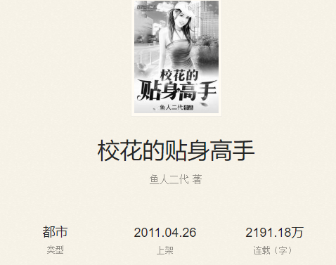 起点中文网显示,《校花的贴身高手》作者鱼人二代,网站上的简介写着“阅文集团白金作家,作品广受好评,都市最畅销作家之一”。这是一部都市修真类网络小说,内容基本上就前期都市追校花,后期转入修真大战。这类网文已经流行了多年,受众非常广。