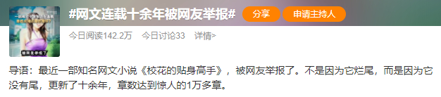 3月15日, 话题#网文连载十余年被网友举报#登上微博热搜,阅读量高达1.7亿。有媒体报道,小说《校花的贴身高手》被网友举报了,但不是因为它烂尾,而是因为它没有结尾——作者更新了十余年,章数达到惊人的1万多章,虽然被网友质疑写得越来越水,却迟迟不肯收官。