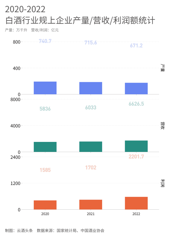 2020-2022年,白酒行业的营收分别为5836亿元、6033亿元、6626.5亿元;实现利润分别为1585亿元、1702亿元、2201.7亿元,营利双增,且增幅明显。