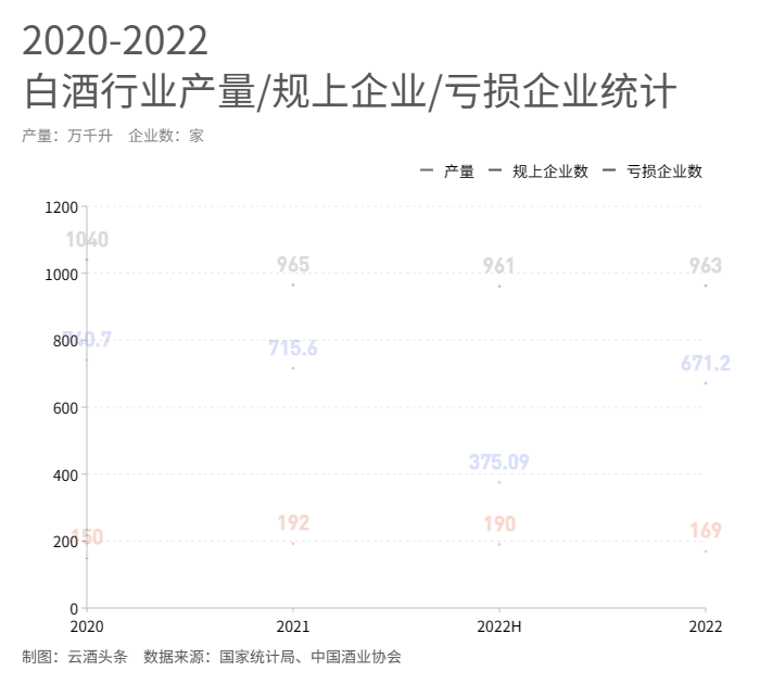 在白酒产量持续下滑的背景下,白酒企业的数量也不断减少。2020年,我国规上(即年产值2000万元以上)白酒企业为1040家;2021年,规上白酒企业为965家;2022上半年为961家,其中190家亏损,全年数量或许会进一步减少。