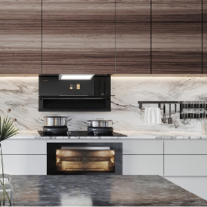 下方烹饪区炉头火力达到4.5kw,灶具加上了隔热聚能罩,夏天开大火也不用担心太烫手,设计很贴心。消毒柜款的机柜有150L的大空间,通过紫外线+臭氧双重消杀,除菌率可达99.9%,加上低温双效烘干排气的设计,保持内部干爽,卫生健康;如果选择蒸烤箱款,蒸烤区运用温湿双控科技,通过精准控温、自主控湿实现大师级烹饪效果,同时拥有烟灶、烟蒸等多种智能联动。