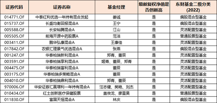 Choice统计显示,截至3月15日,共有14只主动权益基金最新复权净值创出历史新高,其中普通股票型2只,偏股混合型4只,灵活配置型8只。