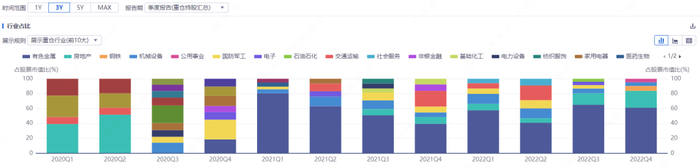 但是,细看行业,他并非只布局有色金属,机械设备、房地产、国防军工、交通运输、非银金融等都会涉猎。