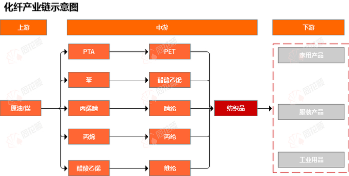 化纤行业是纺织服装行业上游,主要提供面料纺纱所需的化学纤维。化纤产业链上游是原油、天然气和煤炭三大基础能源(以原油为主)。下游主要为纺织,根据化纤不同品类的性质可以对应纺织业中的家用纺织、服装用纺织、产业用纺织等子行业。中游为以PX(对二甲苯)、PTA(精对苯二甲酸)、MEG(乙二醇)、己内酰胺等为核心的石化、煤化中间品。