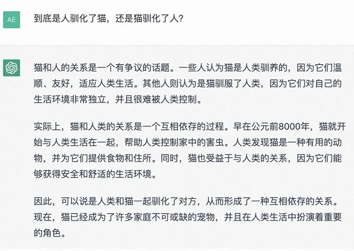 比如华大基因的CEO尹烨像ChatGPT提出“是人驯化了猫,还是猫驯化了人”的问题,它的回答就有理有据,有辩证有思考。