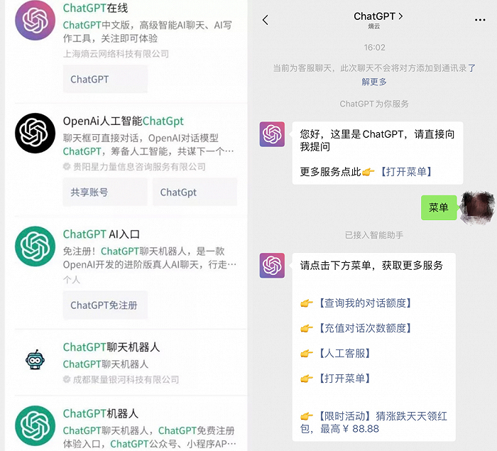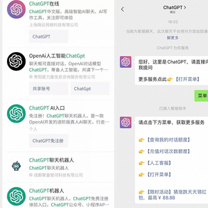 除了这些大公司,在国内,也有不少人用打擦边球赚差价的方式,靠ChatGPT赚上一桶金。他们在国内平台上,通过注册海外官方账号为国内用户提供“人工智能交互”服务,以此牟利。在命名和产品设计上和ChatGPT官方极为相似,给人以ChatGPT中国官网的错觉。