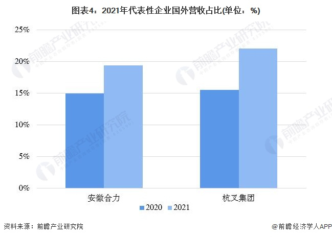 我国叉车制造企业的品牌知名度、技术创新能力、产品系列完整性以及产品质量管理等方面不断提升,出口量呈现稳步增长。根据中国工程机械工业协会工业车辆分会的统计数据,2021年我国出口叉车产品共31.58万台,较2020年增长了73.82%,出口量占海外市场销量的39.29%。从代表性企业的出口业务来看,2021年两家企业的国外销售收入占比均有提升,达到20%左右,体现海外市场给予了本土企业较高的认可度。