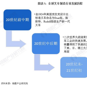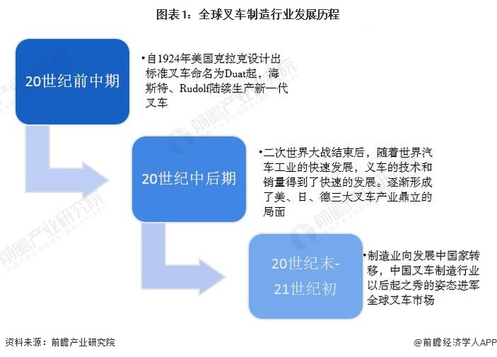 从全球叉车制造行业发展历史已经有百余年,主要可为三个阶段: