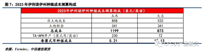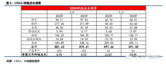 伊利诺伊大学测算的种植成本预估远高于2022年11月USDA对2023年美豆、美玉米的成本预估,USDA预计的2023年美玉米种植成本仅870.41美元/英亩,大豆则为591.38美元/英亩。但不同点在于,USDA为全国平均种植成本,其对应的平均单产水平也较伊利诺伊这样的高产州更低,在相应调降作物单产水平后,对应的单位种植成本的差异并没有很显著,甚至比伊利诺伊州的种植成本还要更低一些。