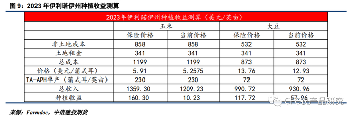 根据伊利诺伊大学的测算,2023年该州的玉米非土地成本858美元/英亩,大豆非土地成本532美元/英亩,土地租金341美元/英亩,玉米合计成本1199美元/英亩,大豆合计成本873美元/英亩。如果使用历史平均单产趋势TA-APH单产来测算,2023年的玉米收益预计将为160.3美元/英亩,高于大豆种植收益的117.72美元/英亩。